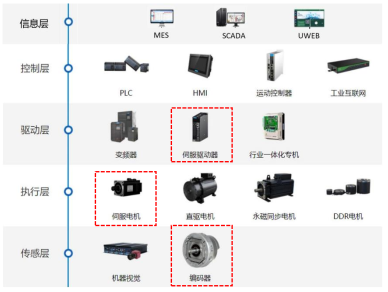在机器人系统中,控制器属于控制层,伺服驱动器与变频器属于驱动层,伺服电机属于执行层。