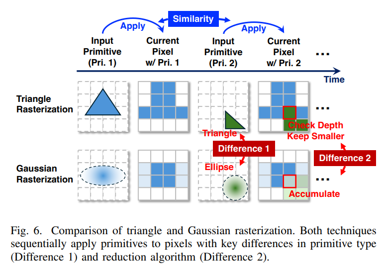 调整现有 GPU 光栅化器:高斯光栅化过程与三角形光栅化步骤相似,这一关键发现促使我们设计了增强型光栅化器——GauRast。此增强功能针对的是两个过程之间的两个关键差异: