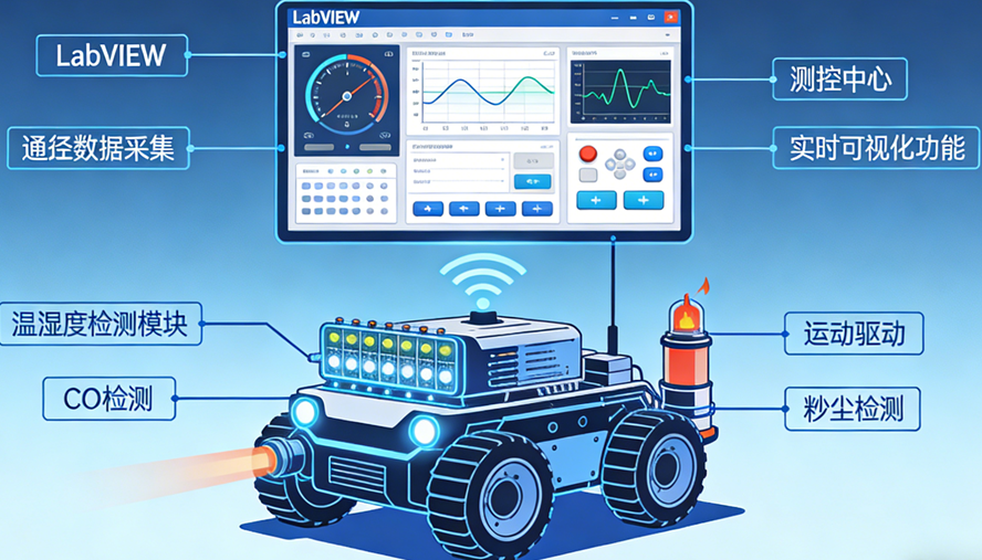 火灾现场的高温、有毒气体、复杂地形等极端环境,对消防人员生命安全构成严重威胁,传统消防机器人普遍存在环境检测维度单一、无线通信稳定性差、控制模式僵化、人机交互不直观等痛点。基于 Arduino UNO 单片机与 LabVIEW 开发平台,打造一款集多参数环境感知、双模控制(自动 / 手动)、远距离无线传输、智能避障、精准灭火于一体的新一代消防机器人,重点强化 LabVIEW 在上位机测控、数据可视化、交互逻辑优化等方面的核心优势,满足现代消防 “远程化、智能化、精准化” 作业需求。