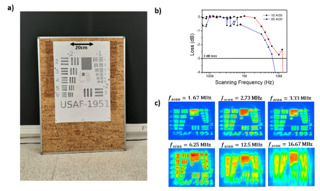 - 3D 成像实验:通过级联第二个正交方向的声光偏转器(AOD)扩展视场维度,对不同距离(1.2 m、2.7 m、4.9 m)的目标进行扫描,验证二维(方位角和仰角)150° 视场的成像能力,并展示 Lissajous 曲线等扫描模式。