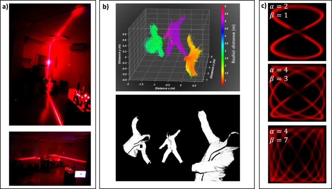 实验室的激光雷达线扫描显示仰角(上)和方位角(下)的大视场角。请注意,上图显示了覆盖从地面到测试室天花板的整个范围的扫描线轮廓超过 150°。b 3D测距演示(上):场景(下)设置了穿着反光服的演员在场景中,距离Z从1.2米到4.9米不等。颜色表示距离。c 使用偏转函数的利萨如扫描,针对不同参数大小以说明在大 FoV 配置中快速光束扫描的激光投影功能。