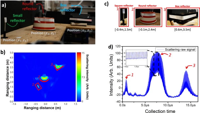 a 现场摄影。b 使用高反射带对桌子上移位的三个物体进行测距图像,以提高返回信号的强度。在(1)中,(2)一个带有反射器的圆形物体中使用了带有小反射器的柱子,在(3)中,有一个箱形反射器,周围有胶带。该图显示了正确测距距离 X(扫描尺寸)和 Z(测距尺寸)的图像,显示了感应所有三个物体的能力。c 根据(b)中的测距图像,单个物体的位置。d 为相应图像收集的原始信号,表明朝向法向的物体具有更大的散射强度,插图显示用于确定 ToF 测距距离的单脉冲