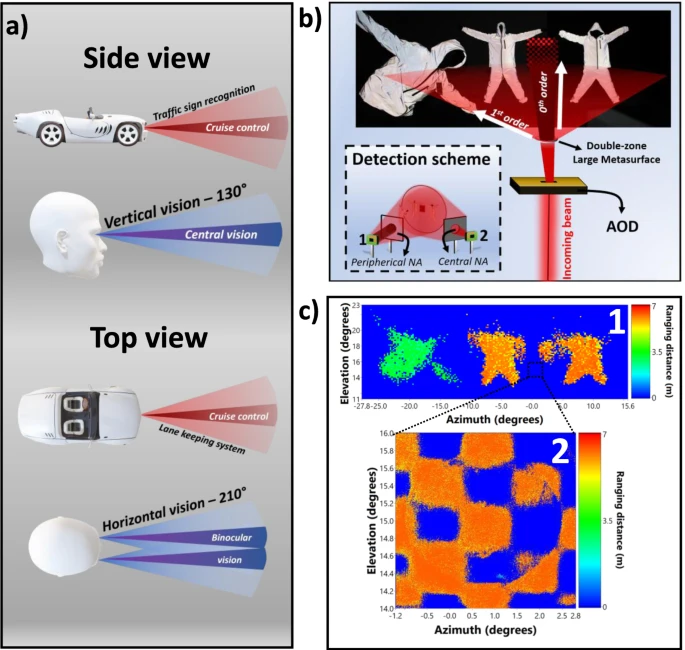 仿生视觉的多区域成像能力:通过设计特殊超表面实现双模式成像 —— 零级光束提供高分辨率小视场(类似人类中央凹视觉),一级光束提供低分辨率大视场(类似人类外周视觉),首次在激光雷达中实现同时获取不同空间分辨率的多区域图像,为自动驾驶等场景的感知决策提供更贴近人类视觉的信息。