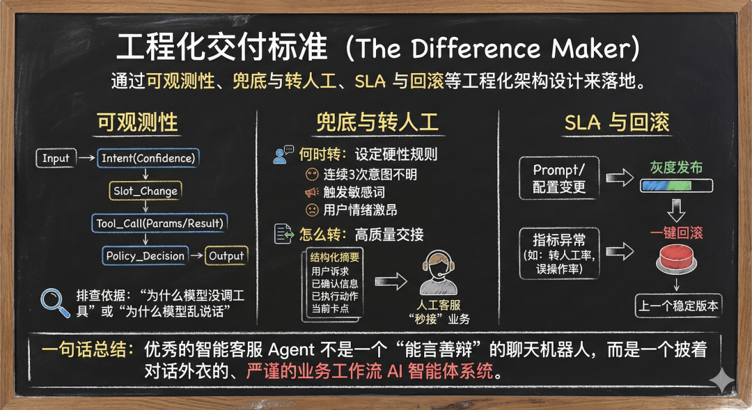 通过可观测性、兜底与转人工、SLA 与回滚等工程化架构设计来落地。