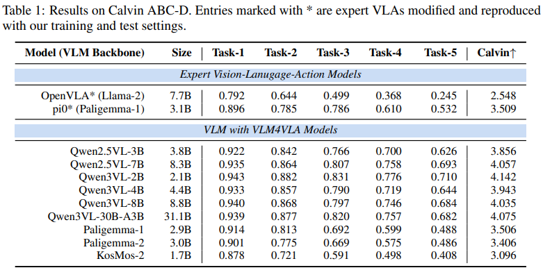 典型案例包括基于 Qwen3VL-2B 的 VLA 模型,在 Calvin 基准上平均完成任务数达 4.142,接近 SOTA 专用 VLA 模型,且参数规模更小、训练效率更高。