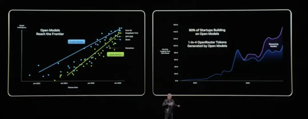 他特别用大量篇幅盛赞了开源模型的革命性作用,并再一次感叹了DeepSeek让世界震惊,开源让AI迅速扩散,没有人愿意掉队。“开源模型已经触及技术前沿,”黄仁勋表示,虽然顶尖开源模型与最前沿专有模型之间仍有约6个月的差距,但这种快速迭代正激活全球创新。