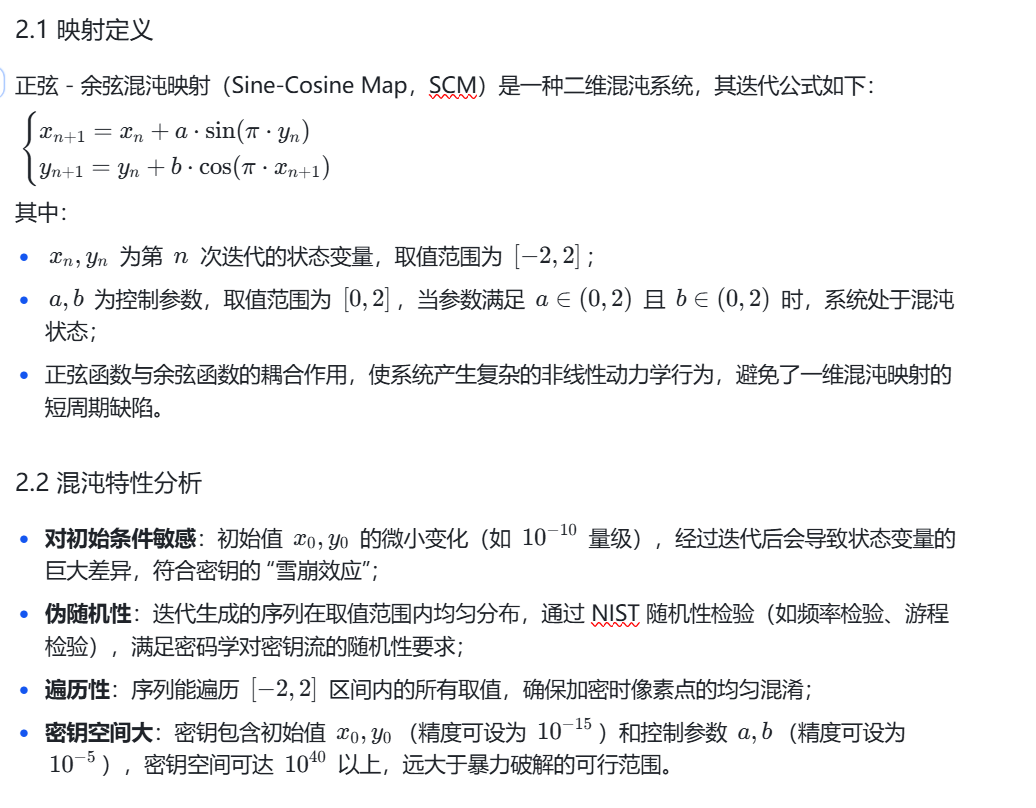 - 采用正弦 - 余弦混沌映射,通过双参数调控提升密钥空间复杂度,抵御暴力破解;