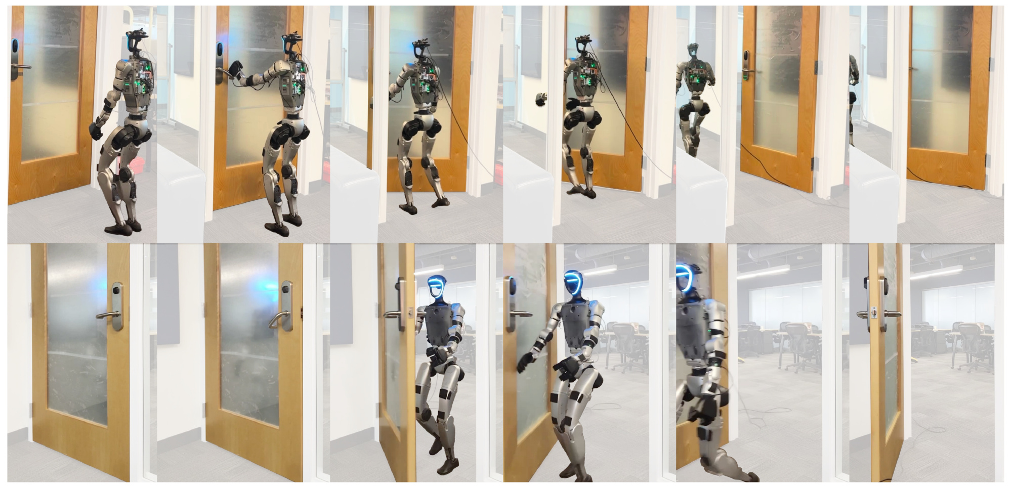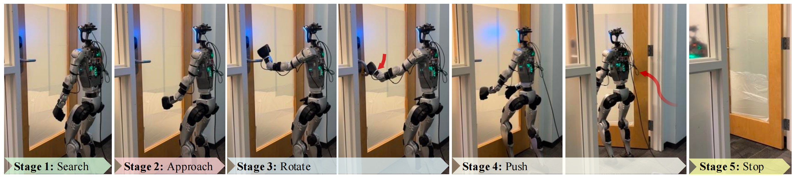 在真实环境中开启多种类型门的研究在实现泛化方面展现出早期潜力 [4],但其平台仅限于机动性受限的轮式机器人 - 相比之下,人形机器人在施加接触力的同时还必须保持平衡,从而使问题显著更加困难