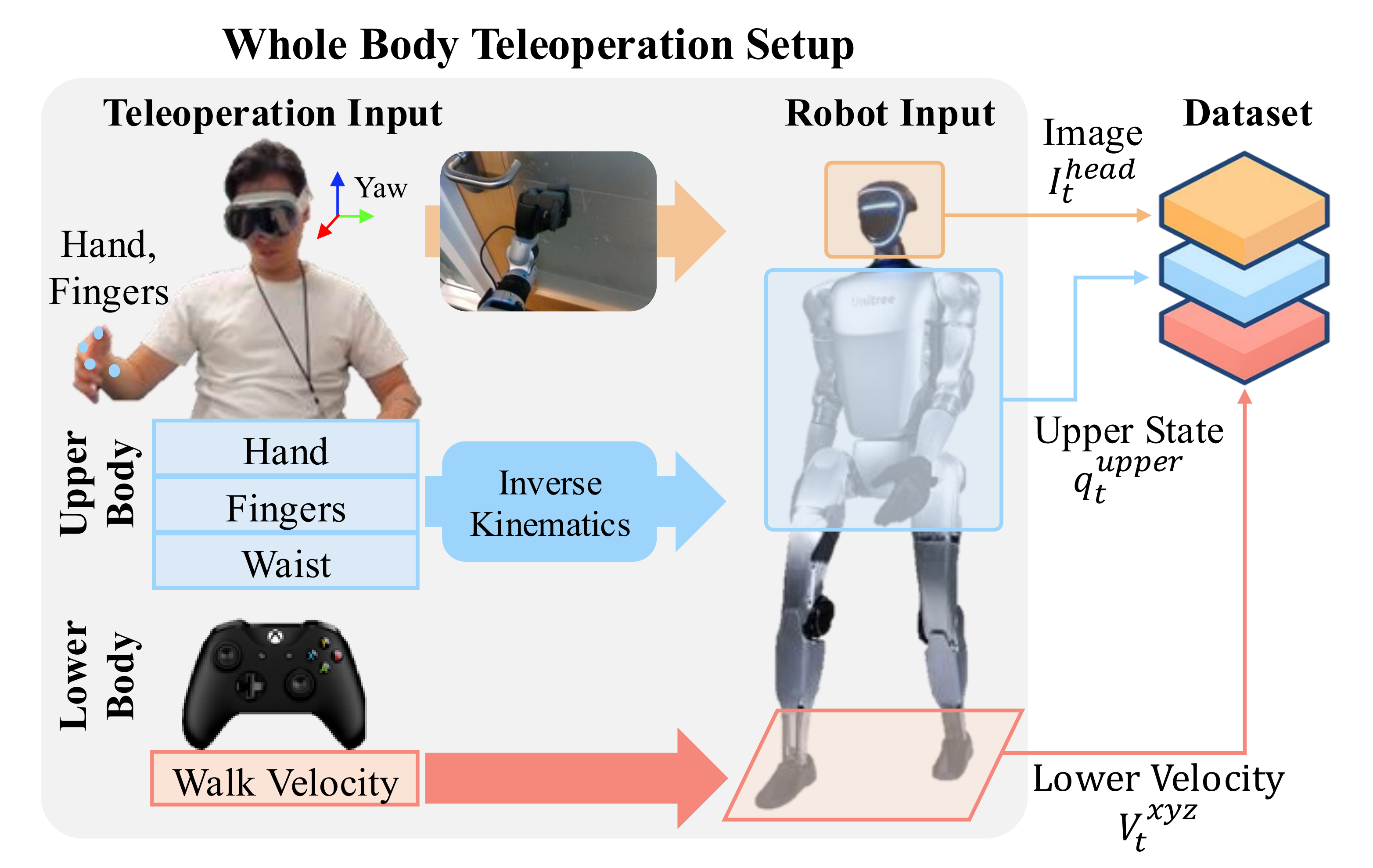- 该系统构建在文献 [19-Open-television] 的基础之上,后者侧重于桌面场景的远程操作,而作者将其扩展以支持行走