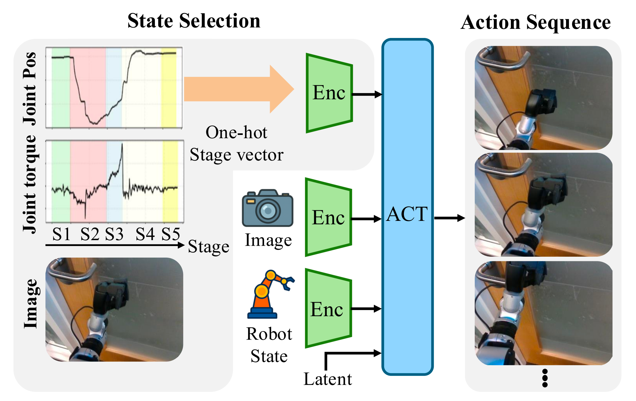 遵循 ACT 框架,StageACT 将模仿学习表述为一个生成建模问题。其核心思想是:不再把人类示范表示为单一的确定性轨迹,而是表示为可行动作序列上的分布
