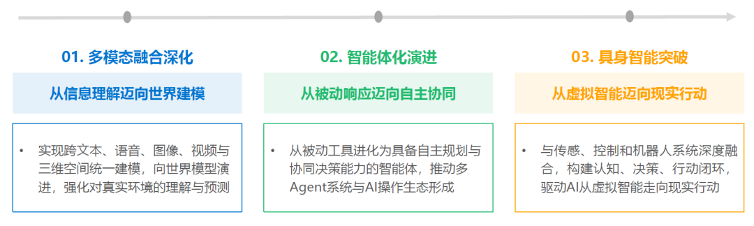 技术演进呈现三大方向:多模态融合深化,实现跨文本、语音、图像的统一建模;智能体化演进,从被动工具升级为自主规划的协同系统;具身智能突破,推动 AI 与物理世界深度融合。其中具身智能潜力巨大,2030 年市场规模预计达 4000 亿元,2035 年有望破万亿,机器人与自动驾驶为核心赛道。