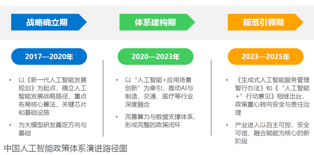 大模型已成为中国科技创新与产业安全的战略支点,政策体系形成 “创新驱动、基础强化、场景牵引、安全治理” 四位一体格局。从 2017 年确立发展战略,到 2020 年后推动 AI 与行业深度融合,再到 2023 年聚焦安全与责任治理,政策闭环持续完善,为产业发展筑牢制度根基。