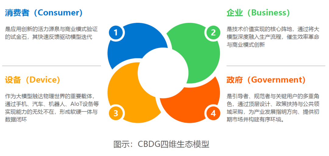 CBDG 四维生态(消费者、企业、设备、政府)成为中国大模型发展新范式。消费者提供创新活力与反馈,驱动模型迭代;企业是技术价值落地核心,催生效率革命;设备作为物理世界接口,形成软硬一体闭环;政府则以引导者、规范者角色构建有序环境。