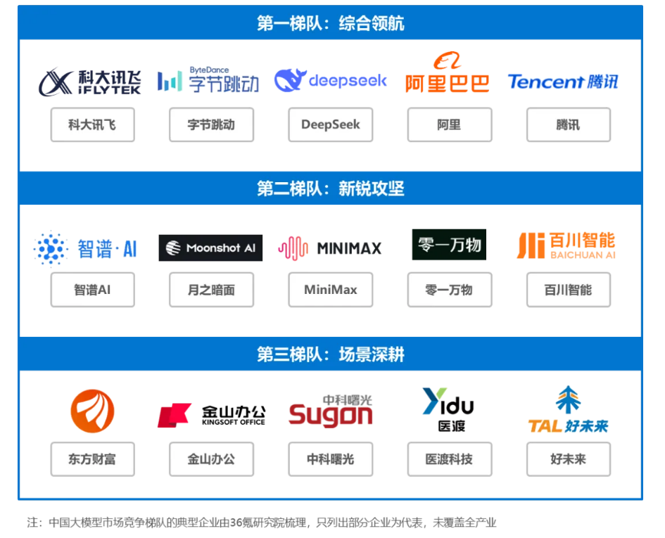 市场竞争梯队已逐步稳定,第一梯队由阿里、腾讯、字节跳动、科大讯飞等全栈布局的科技巨头组成。科大讯飞凭借百万级开发者生态、政企市场领先优势及具身智能布局稳居前列;字节跳动以 C 端流量为核心,通过数据飞轮反哺模型迭代;阿里则以夸克为尖兵,转型 AI 工具集打造高粘性用户体系。此外,模型技术新贵、垂直领域深耕者、AI 1.0 转型者及科研机构共同构成多元竞争格局。