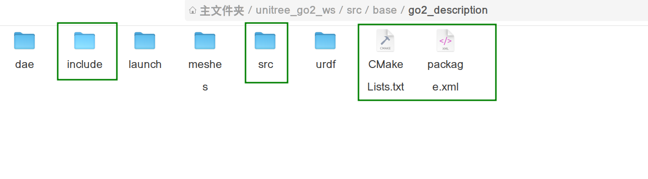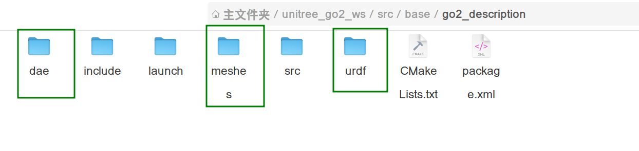 下载后解压缩会得到GO2_URDF文件夹,然后要将GO2_URDF下的dae、meshes、urdf三个子文件夹,也就是框住的三个文件夹复制到~/unitree_go2_ws/src/base/go2_description目录下。