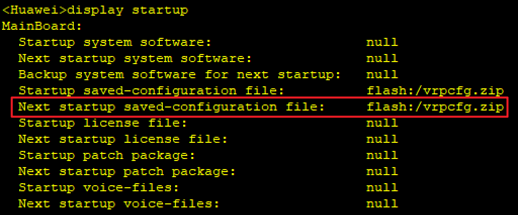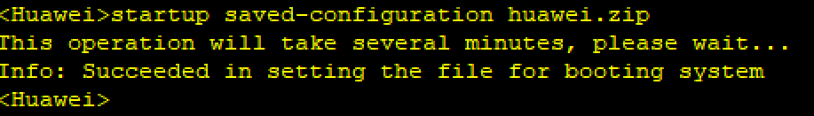 startup saved-configuration huawei.zip 设置下一次启动时的配置文件为huawei.zip