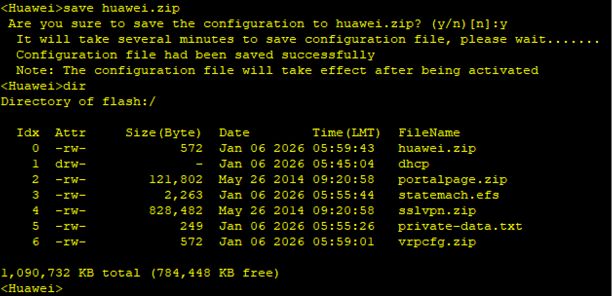 dir 查看设备的文件目录信息,可以看到有前面保存的huawei.zip文件