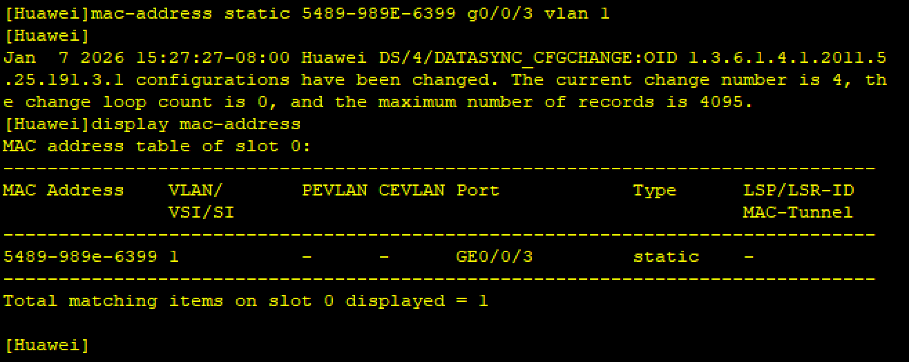mac-address static 5489-989E-6399 g0/0/3 vlan 1 静态添加一个MAC地址