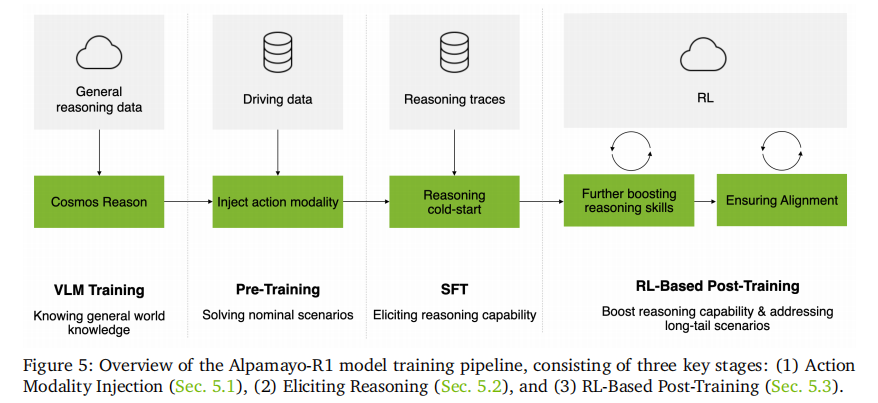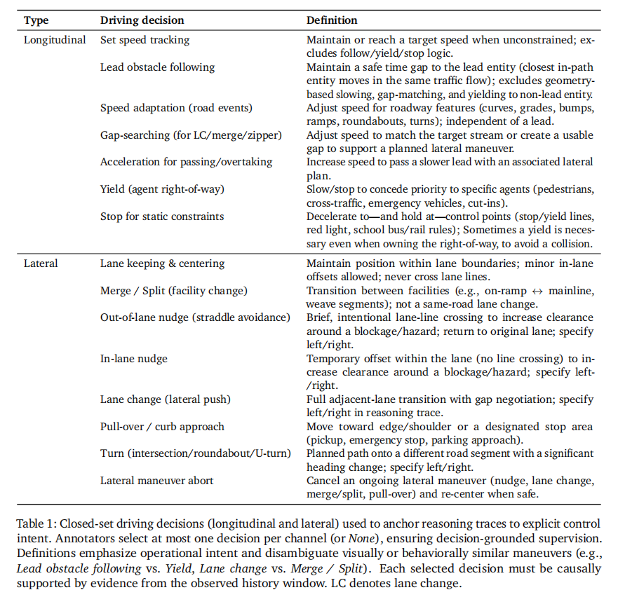 - 决策接地:每个推理轨迹锚定明确的驾驶决策(如跟车、避让、变道);
