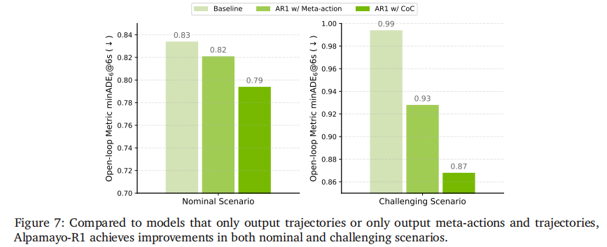 - 挑战场景(表 7):AR1 的 minADE 达 0.868m,比轨迹仅基线提升 12%,验证了推理对复杂场景的增益;