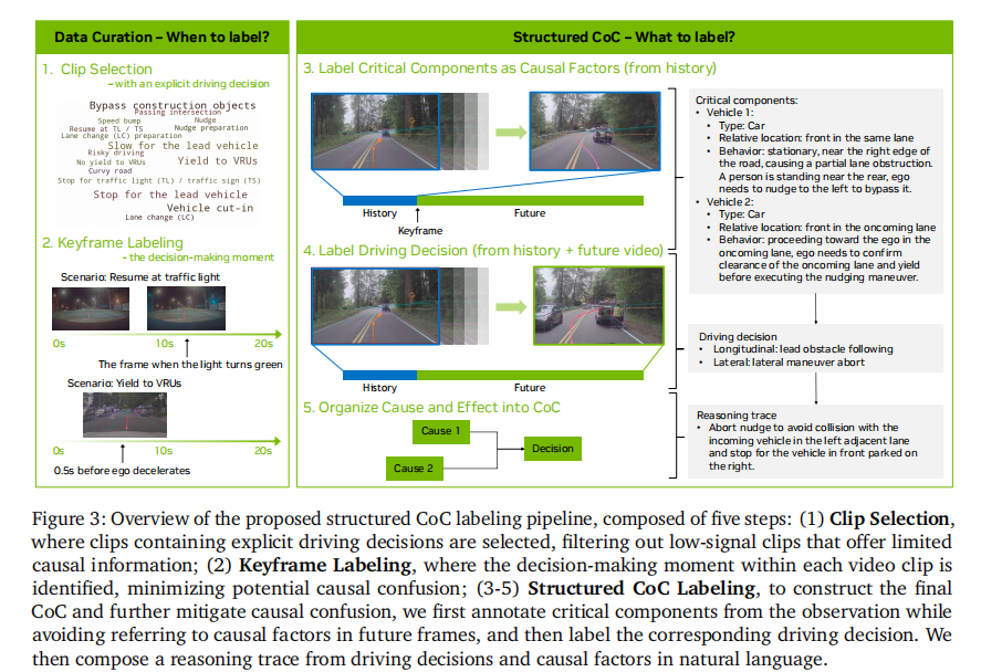 - 阶段二(0-8s):筛选有效数据、选择驾驶决策、撰写因果推理轨迹,严格关联阶段一标注的因素。