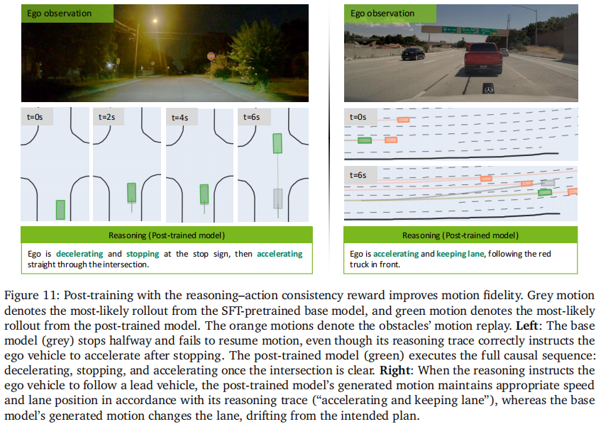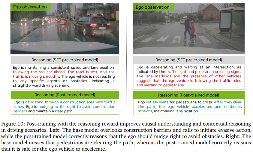 定性结果显示(图 10、图 11),后训练后的模型能更准确识别关键场景因素(如施工区域、行人),并确保推理描述与实际驾驶动作严格一致