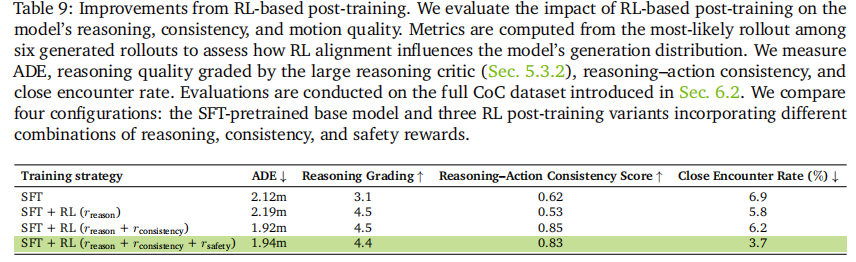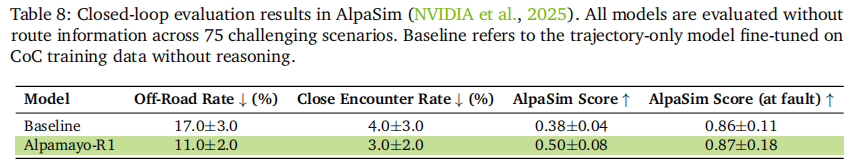 - AlpaSim 分数从 0.38 提升至 0.50,证明推理能力显著提升了闭环驾驶的安全性和稳健性。