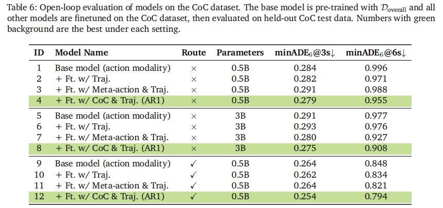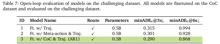 - 常规场景(表 6):0.5B 参数 AR1 在 6 秒预测 horizon 上的 minADE 达 0.794m,比轨迹仅基线提升 4.8%;3B 参数模型进一步提升至 0.908m;