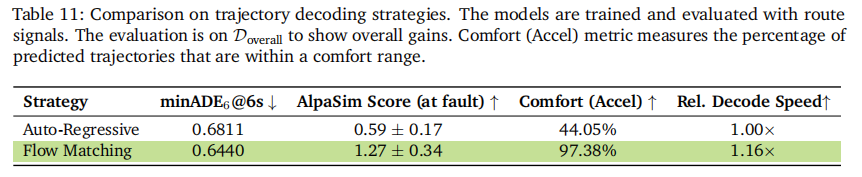 - 动作模态注入(表 11):流匹配解码相比自回归解码,在 minADE 降低 5.4% 的同时,解码速度提升 16%,舒适性指标提升 121%;