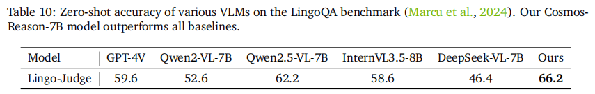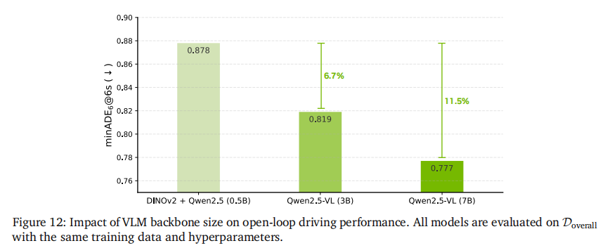 - VLM backbone 选择(表 10、图 12):Cosmos-Reason 在驾驶场景理解基准 LingoQA 上达到 66.2% 准确率,优于 GPT-4V(59.6%)等通用 VLM;模型规模从 0.5B 扩展到 7B,minADE 降低 11%,证明物理 AI 预训练和模型缩放的双重价值;