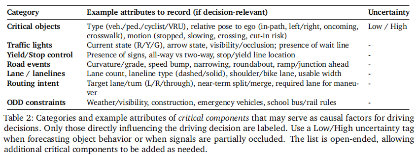 - 关键组件类别(表 2):开放式类别设计,包含关键物体、交通灯、道路事件等,支持灵活标注决策相关因素;