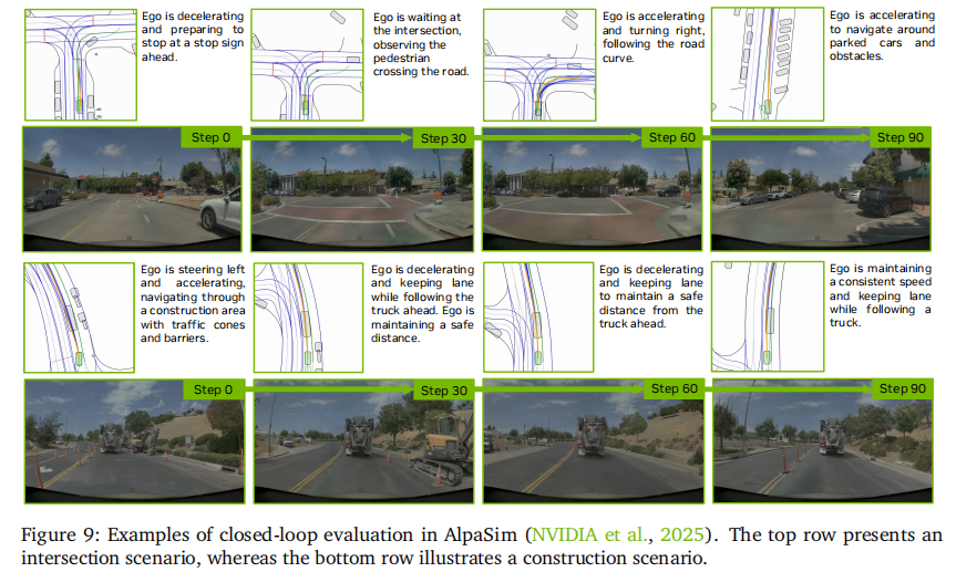 - 闭环(AlpaSim 模拟器):偏离道路率、近距离碰撞率、AlpaSim 分数(事件间行驶距离);