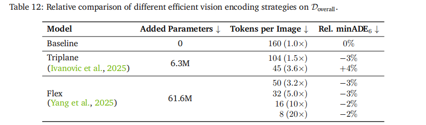 - 视觉编码策略(表 12):triplane 编码实现 3.6 倍 token 压缩,Flex 编码最高实现 20 倍压缩,且均保持与基线相当的驾驶性能,为实时部署提供可能。