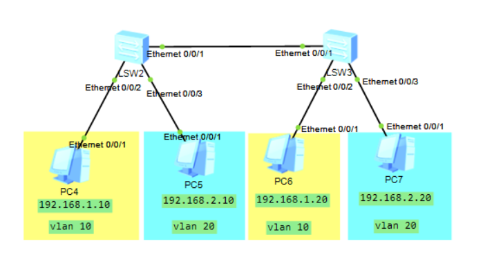 [LSW2-Ethernet0/0/1]port trunk allow-pass vlan 10 20 //允许VLAN 10、20通过