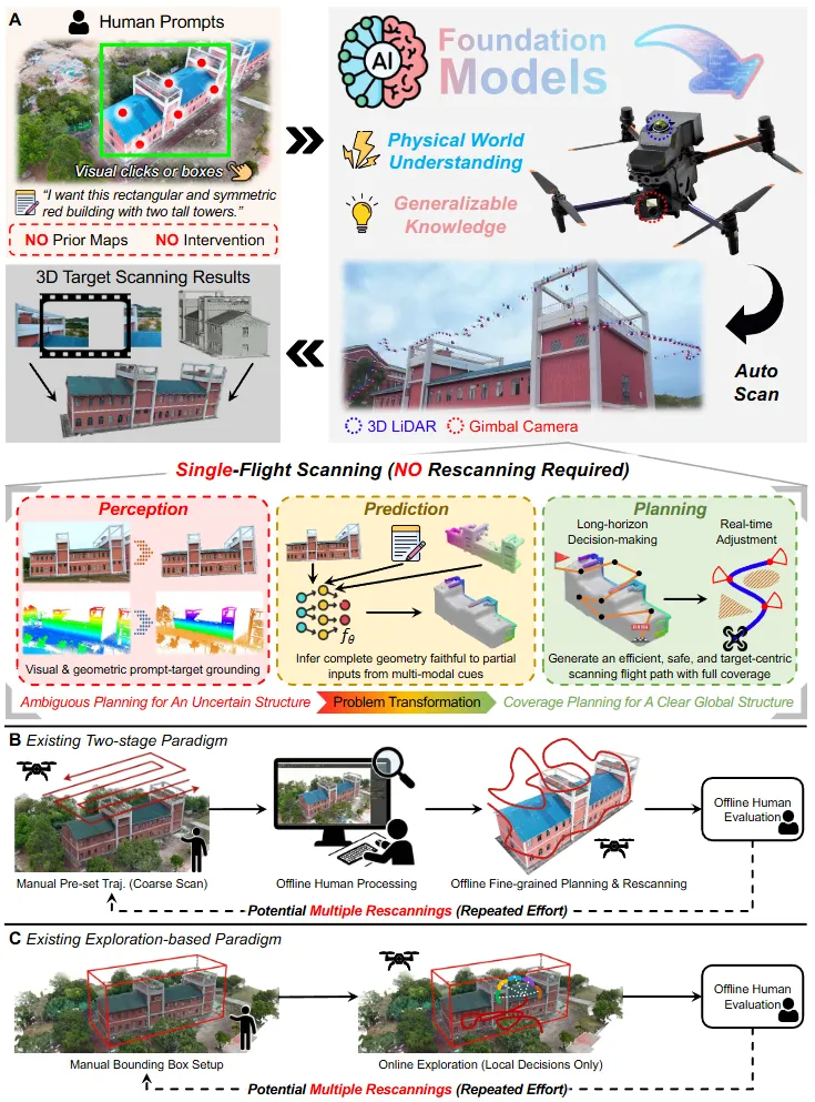 图1|FlyCo 概览:把“低门槛提示”变成无人机的自动扫描行动。(A) FlyCo 是一个由基础模型赋能的空中自主系统,面向开放环境的“指定目标结构”三维扫描。它把基础模型自带的知识与无人机的自主飞行能力结合起来,把用户的文字描述、少量视觉标注等低成本提示,转化为可执行的飞行动作,在未知环境中高效完成目标扫描。整个过程由“感知-预测-规划”的闭环驱动,不依赖人工介入,也不需要环境先验。(B–C) 对比之下,现有范式往往依赖更重的人类先验与参与,且一旦扫描不完整就容易触发反复补飞,导致开放世界场景中的实用性、效率和适应性都受限