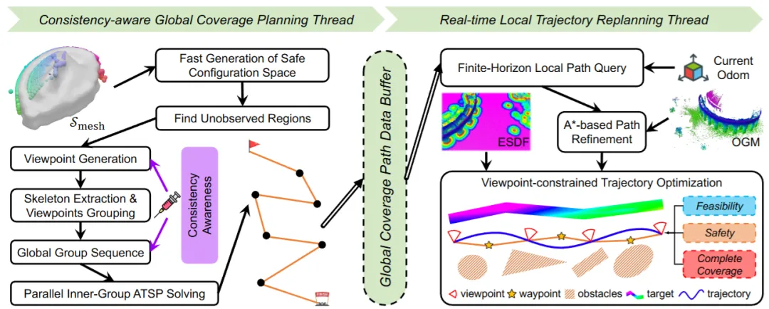 图5|“预测感知”的分层规划:全局覆盖想得远,局部轨迹躲得快。全局线程基于预测网格生成视点集合,并并行求解非对称旅行商问题(ATSP)得到一条全局覆盖路径缓冲;同时局部线程并发生成最短时间、可行且安全的局部轨迹,在保证目标覆盖的前提下进行实时避障与跟踪执行