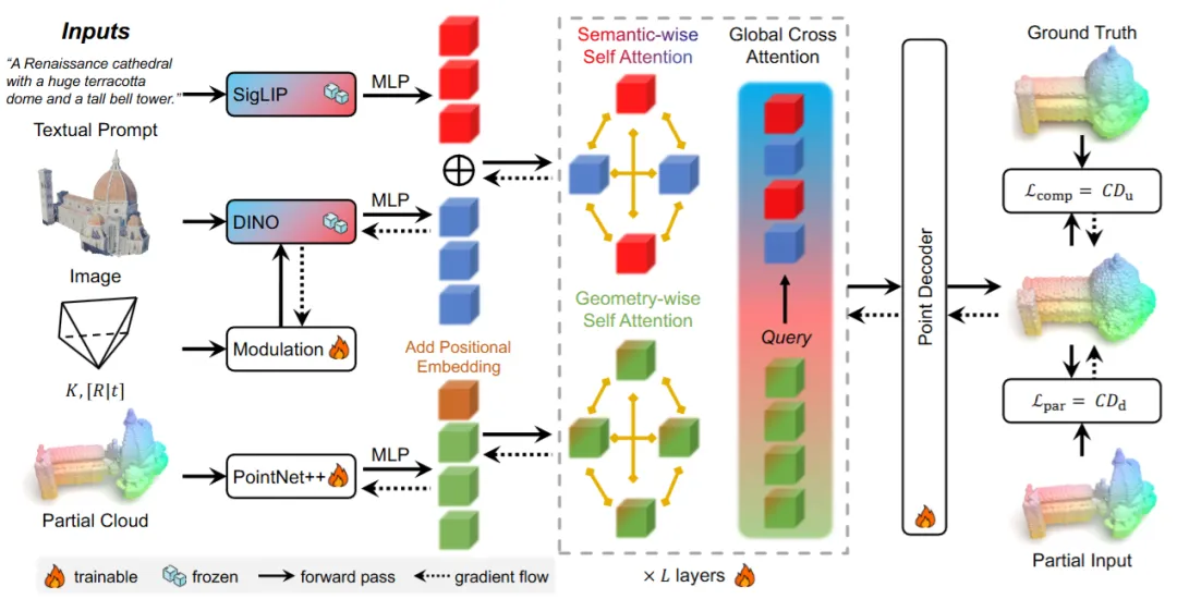 图3|多模态表面预测器:先分别编码,再交替融合,最后输出补全形状。预测器先用基础模型分别对各模态信息进行编码,再通过交替注意力机制融合不同来源的特征,最终解码得到完整的目标形状;训练时同时约束“与已观测部分一致”和“整体补全质量”,用部分一致与补全两类 Chamfer 距离损失联合监督