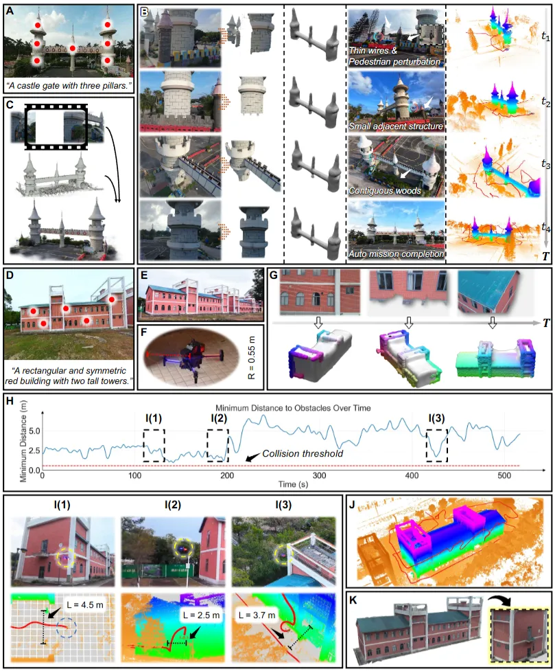 图8|杂乱环境里的高效且安全扫描:目标对齐更准,避障更稳。(A,D) 用户用“文本 + 少量点击”指定城堡门与红砖建筑;(B) 城堡门任务:从左到右依次展示目标分割、补全后的完整表面、关键静态障碍与动态干扰(如细电线、行人、相邻结构、林木等),以及对应的三维目标分割(彩虹色)与实际执行轨迹;(C,K) 两个任务的高保真重建效果;(E) 红砖建筑场地概览;(F) 无人机尺寸说明(半径 0.55 m);(G) 红砖建筑任务:分割与在线表面预测始终与局部观测保持一致;(H) 飞行过程中与障碍物的最小距离随时间变化,始终高于碰撞阈值(等于无人机半径,红色虚线);(I(1–3)) 关键飞行瞬间截图,展示在狭窄空间中的安全穿行(例如靠近墙体与植被的约 2.5 m 缝隙);(J) 环绕红砖建筑的完整飞行结果