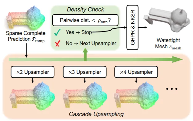 图4|推理阶段的几何加密:从稀疏补全到可用网格。系统先得到较稀疏的补全结果,再按照物理尺度做级联上采样,自适应提高几何分辨率,最后提取封闭(watertight)的网格模型,供后续覆盖规划使用