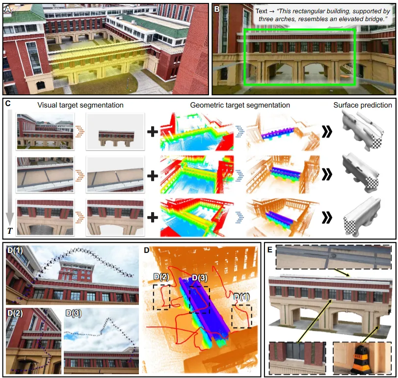 图6|精细场景理解带来“只围着目标扫”的自适应扫描。(A) 目标:连接两栋建筑的拱桥;(B) 用户输入的文本与少量点击标注;(C) 从左到右为三个时刻的结果:目标分割更精准、表面预测更合理,即使面对相似纹理与结构连通带来的干扰也能稳定工作;(D) 飞行只围绕目标结构执行扫描,并给出对应的真实飞行画面 D(1–3);(E) 最终重建结果聚焦于拱桥本体,细节更完整、更干净