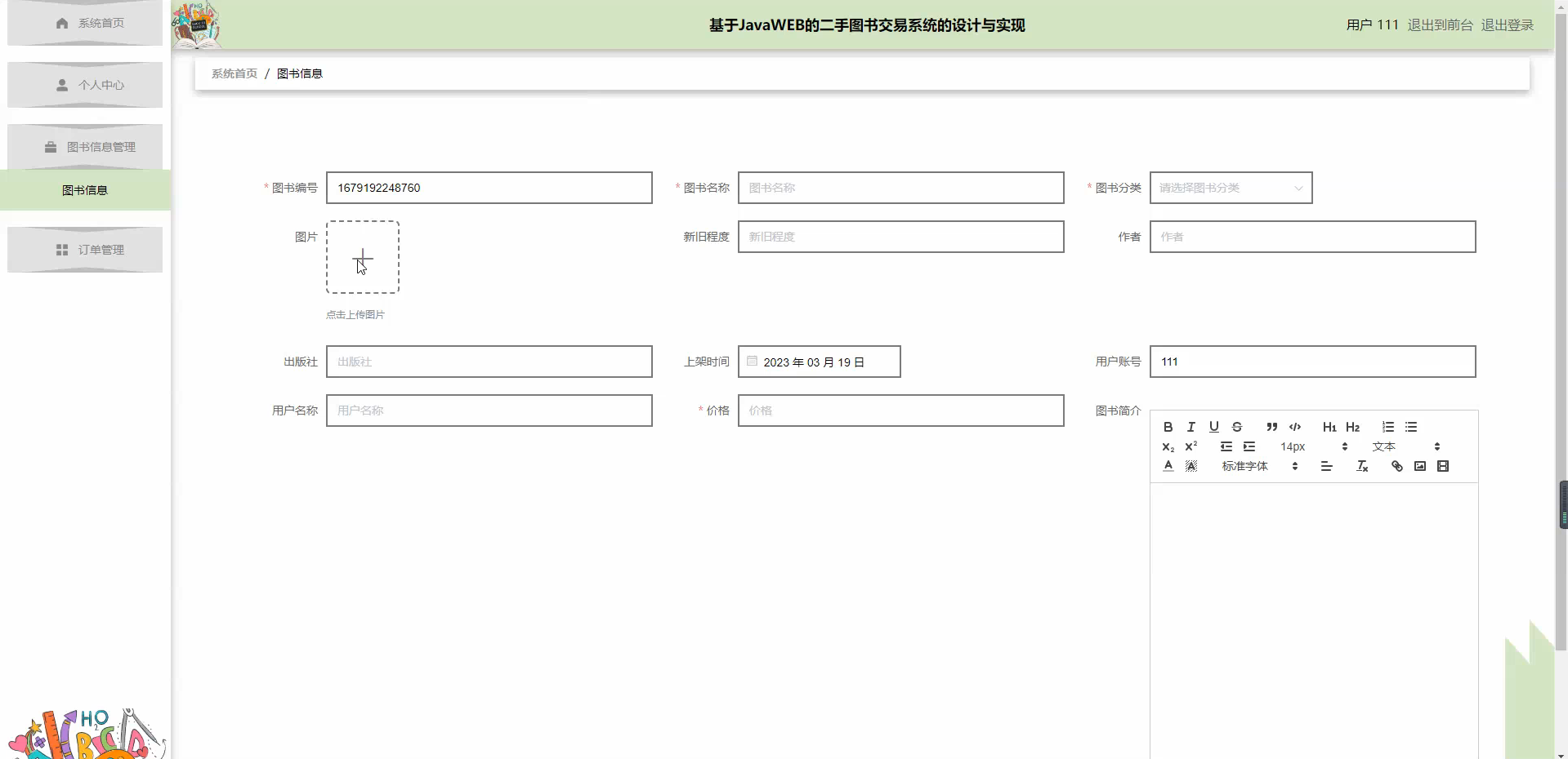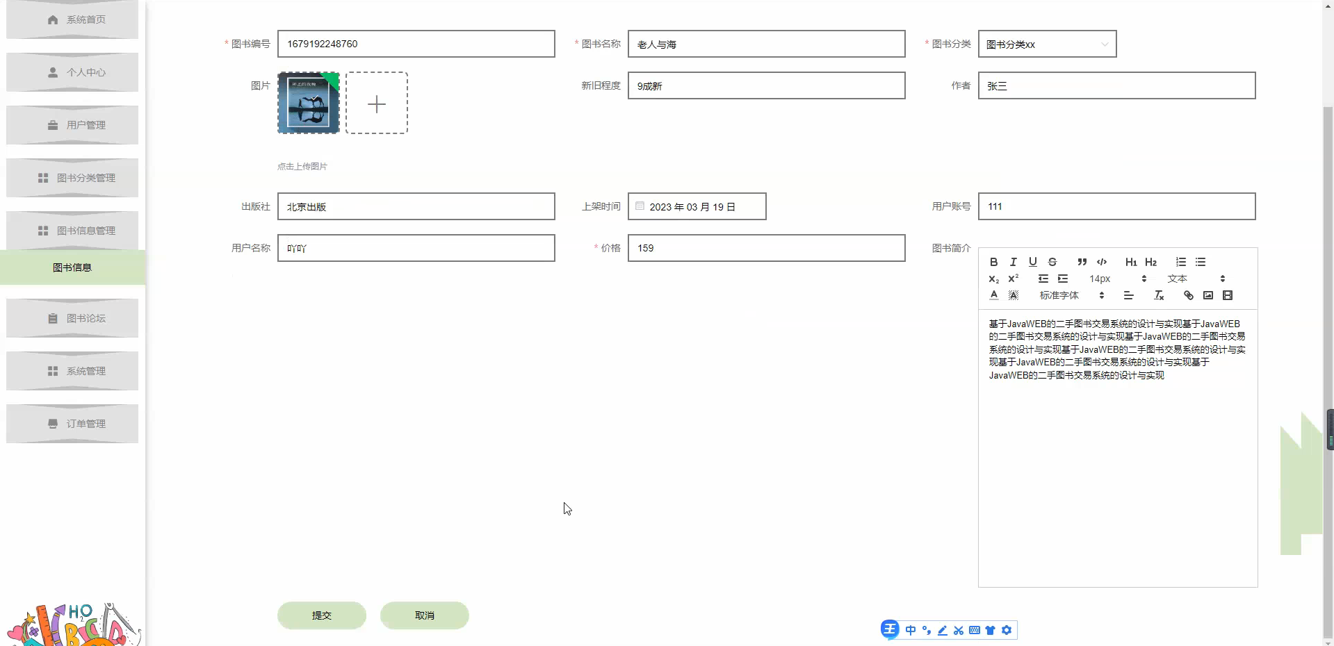 - 图书管理模块:卖家可发布图书信息,包括书名、作者、出版社、出版年份、ISBN号、新旧程度、价格、图片等详细信息,并对已发布图书进行修改、删除和下架操作。买家可查看图书列表和详情,收藏感兴趣图书。