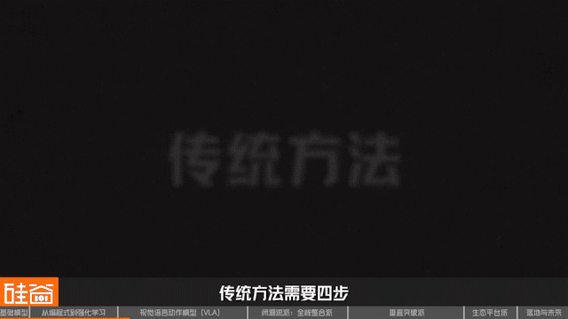 举个例子,你对机器人说:“帮我把桌上的苹果放到篮子里。”传统方法需要四步: