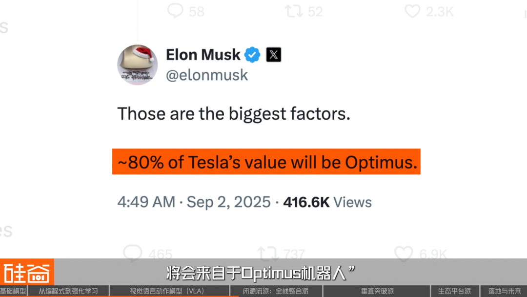 作为这个流派最激进的代表,特斯拉的CEO马斯克曾经说过一句很狂的话:“特斯拉八成的价值将来自于Optimus机器人。“