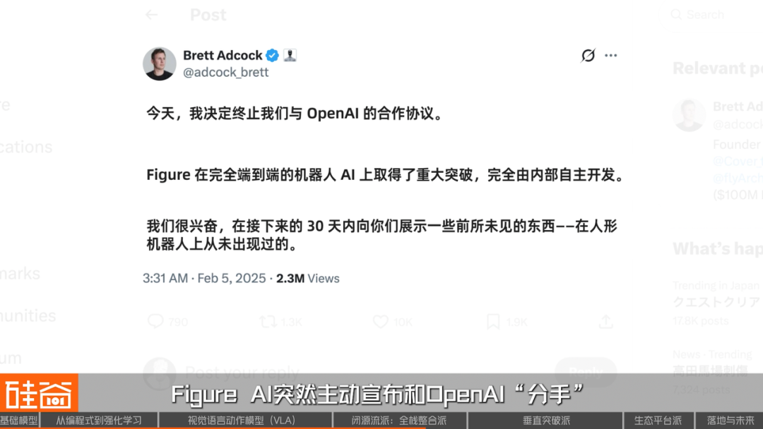 但好景不长。2025年2月,Figure AI突然主动宣布和OpenAI“分手”:他们要独立推出自己的基础模型,不再依赖OpenAI的技术。分手后的Figure AI,两周后就迅速推出新Helix模型,定位为通用人形机器人VLA模型,强调是完全自研、用于控制整个人形机器人。