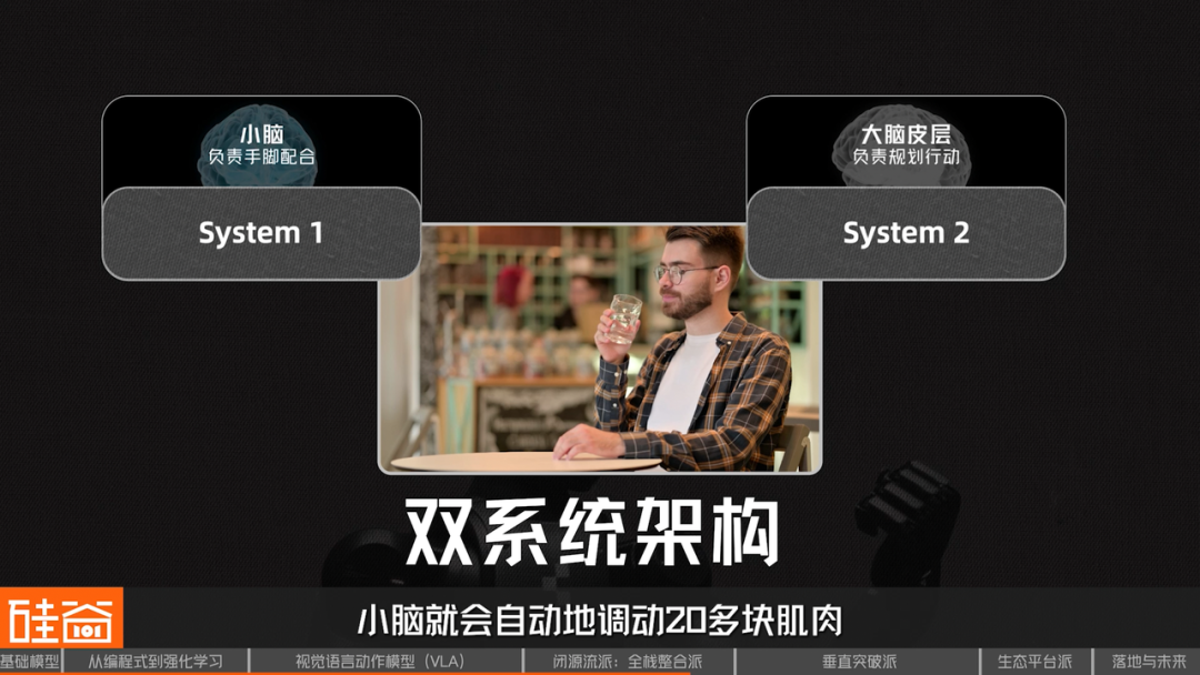 Helix创新地采用了“System 1,System 2”双系统架构:System 2像你的大脑皮层,负责“想清楚该干什么”;System 1像你的小脑,负责“手脚怎么配合”。当你拿杯子喝水时,大脑皮层只需要决定“现在该拿杯子了”,小脑会自动调动20多块肌肉完成抓取动作,你根本不需要意识到。