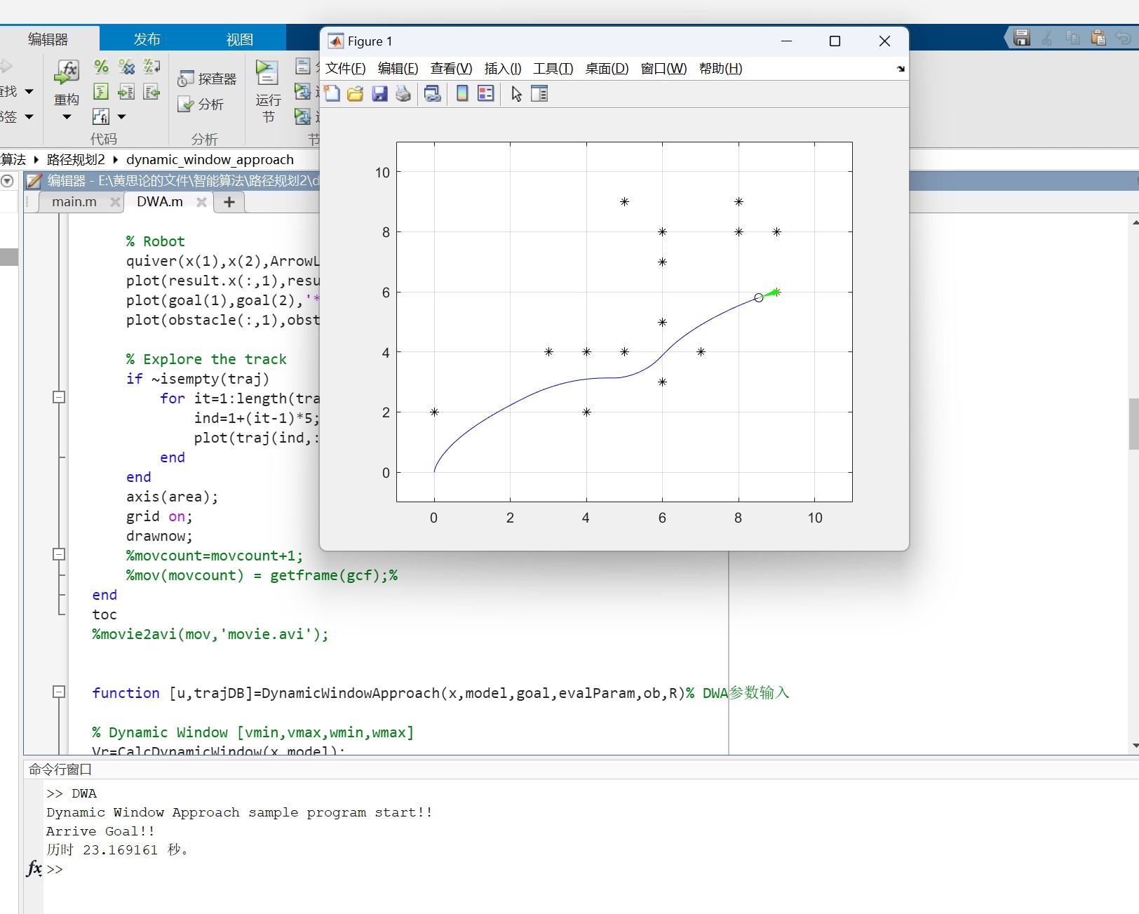 这段代码先用 rrtstar 生成全局路径,然后机器人沿着全局路径分段前进,每段使用 dwaalgorithm 调整路径,以适应动态环境。