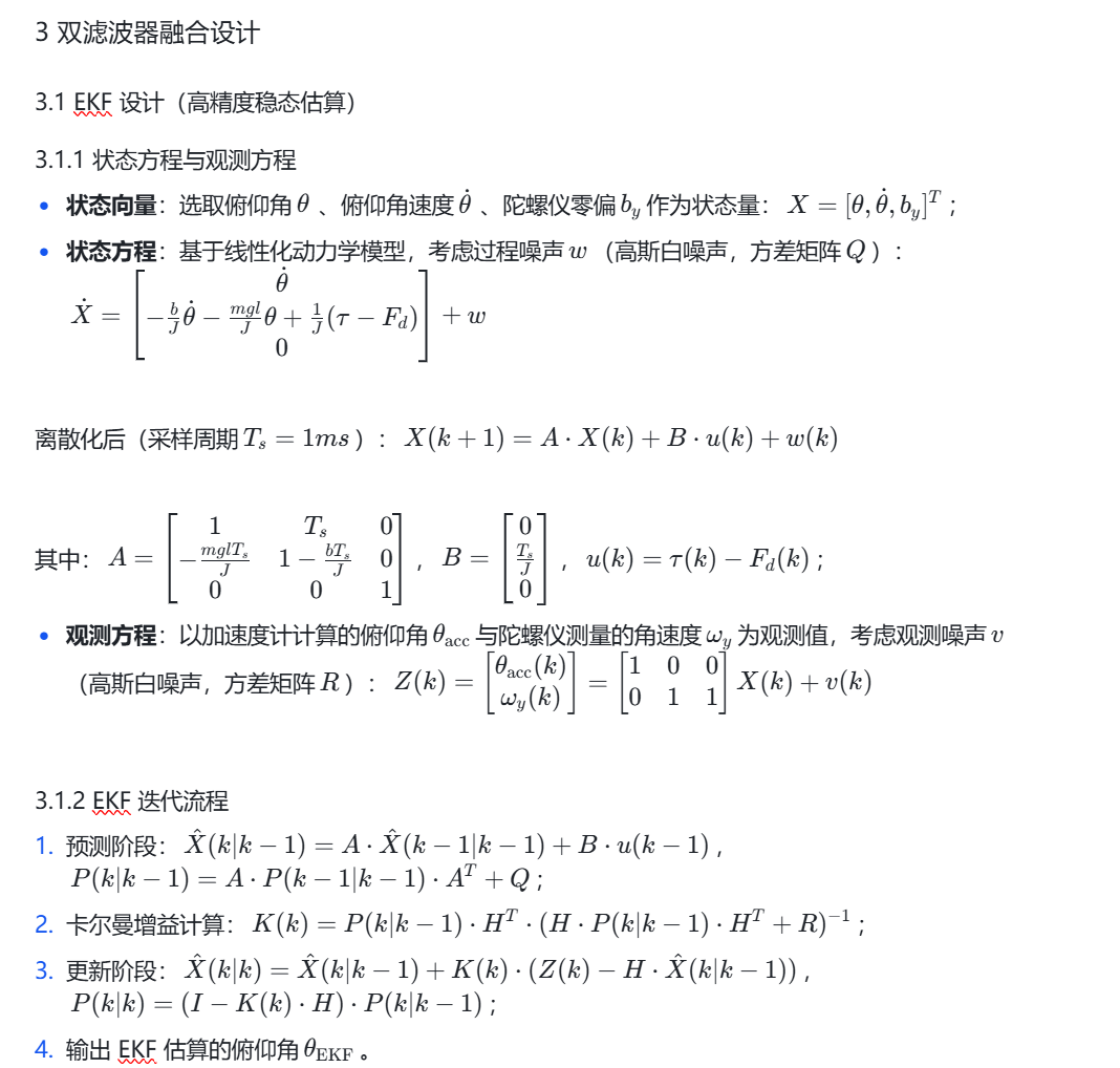 针对两轮平台(自平衡车、两轮机器人)俯仰角估算中 “加速度计易受振动干扰、陀螺仪存在积分漂移” 的核心矛盾,提出一种 EKF(扩展卡尔曼滤波)与 Madgwick 滤波器融合的俯仰角估算方案。首先建立两轮平台动力学模型与传感器误差模型,明确俯仰角与角速度、加速度的映射关系;其次设计双滤波器融合架构:EKF 利用动力学模型实现姿态角最优估计,抑制陀螺仪漂移,Madgwick 滤波器通过梯度下降算法快