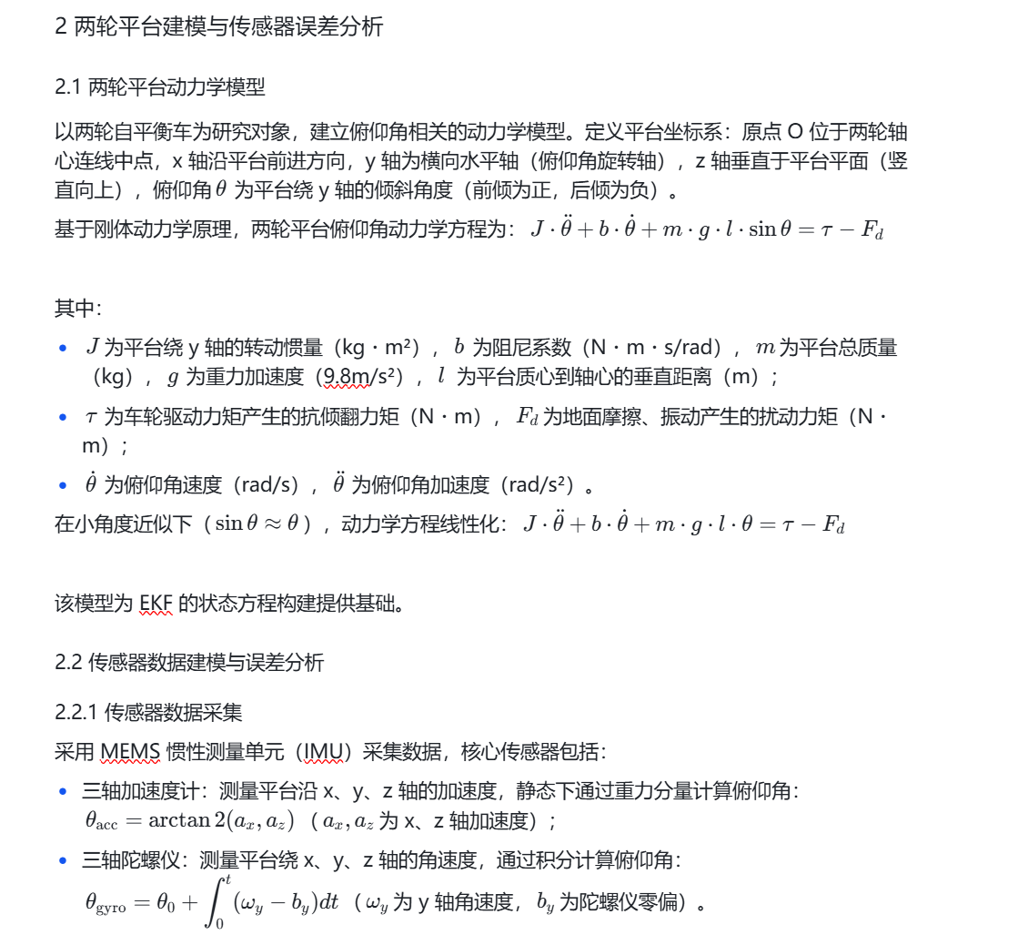 然而,两轮平台俯仰角估算面临两大核心挑战:① 传感器特性局限:加速度计易受平台振动、加减速运动的干扰,静态精度高但动态失真严重;陀螺仪能快速响应角速度变化,但存在零偏漂移,长期积分误差累积 [3];② 平台动态干扰:两轮平台运动过程中(启动、加速、转向、颠簸路面行驶)产生的非线性动力学扰动,进一步加剧姿态角估算误差 [4]。传统单一传感器或单一滤波方法难以兼顾动态响应速度与长期估算精度,亟需构建多传感器融合的滤波方案。