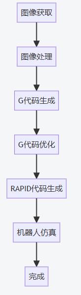基于OpenCV的绘图机器人系统设定中,数据处理流程被设计为一系列模块化的步骤,确保了处理过程的灵活性和高效性。该流程包括图像获取、图像处理、G代码生成、G代码优化、RAPID代码生成以及机器人仿真等环节。每个模块都具备独立工作的能力,同时也支持作为整体工作流程的一部分来协同工作。这种设计使得用户可以根据实际需求选择从任意节点开始处理,例如,如果已经拥有G代码文件,用户可以直接进行G代码优化或RAPID代码生成,而无需从图像获取或图像处理步骤开始。这种灵活性不仅提高了处理效率,还使得系统能够更好地适应不同的应用场景和用户需求。