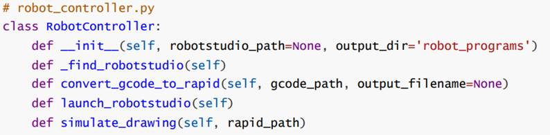 机器人控制模块是绘图机器人系统与实际硬件交互的桥梁,负责将G代码生成模块输出的G代码转换为ABB机器人可执行的RAPID代码。该模块首先解析G代码指令,将其转换为RAPID代码,RAPID是ABB机器人专用的编程语言,用于控制机器人的运动和行为。转换过程中,模块会根据机器人的运动学特性进行必要的调整,确保生成的RAPID代码能够精确控制机器人的运动轨迹。此外,机器人控制模块还具备查找和启动RobotStudio仿真软件的功能,RobotStudio是ABB提供的机器人仿真软件,可以在不接触实际机器人的情况下,模拟机器人的运动和绘图过程。通过该模块,用户可以在计算机上预览机器人根据RAPID代码进行的绘图操作,从而验证绘图的准确性和可行性。机器人控制模块提供的仿真功能不仅提高了绘图的效率和安全性,还降低了实际操作中的风险和成本。通过机器人控制模块的处理,G代码被转换为机器人可执行的指令,并通过仿真软件进行验证,为最终的机器人自动绘图提供了可靠的保障。